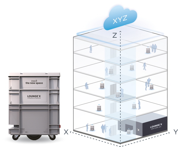 XYZ 로봇 클라우드는 건물 속 모든 로봇과 스마트 장비를 통합적으로 운영할 수 있는 핵심 기술이다. 전원과 위치, 배터리 상태, 작동 현황 등 각 기기의 기능과 관련된 실시간 상태 데이터를 하나의 대시보드에 나타내며, 간단한 조작으로 각 기기가 원하는 동작을 수행하게 한다. PC나 모바일 환경에서 모두 대시보드를 사용할 수 있으며, 기기의 오류나 이상상황 발생 시 메시지 알람까지 받을 수 있다. 로봇 빌딩 솔루션의 시나리오를 예로 들자면, 엑스와이지의 층간이동 배달 로봇 스토리지(Storagy)는 클라우드를 통해 엘리베이터나 출입 시스템과 데이터를 송수신할 수 있다. 나아가, 로봇카페 솔루션 시설이 적용된 건물의 경우 건물 속 어떤 위치에서든 직접 방문 없이 로봇 바리스타가 만든 커피를 스토리지를 통해 받아볼 수 있다.